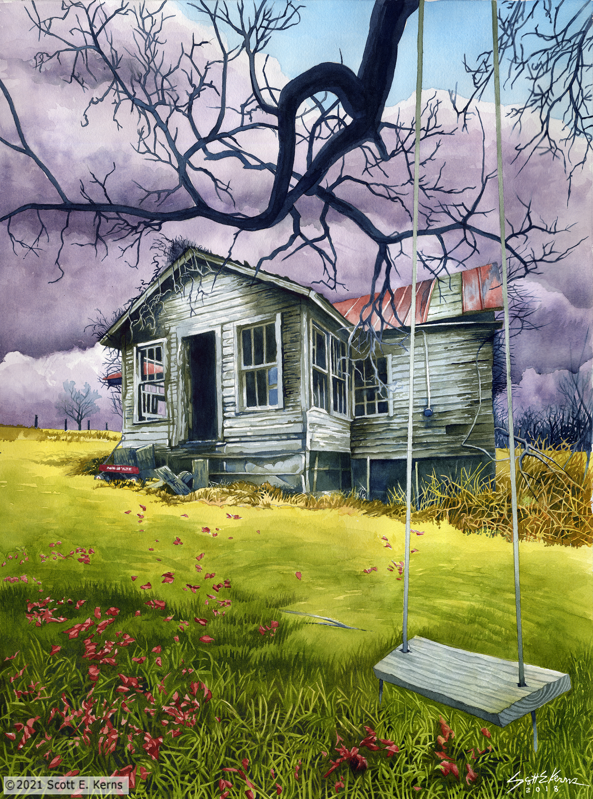 This painting plays tribute to my fascination for abandoned places. My intent was to create an image that captures a dream like moment of discovery and exploration. Tags watercolor painting landscape abandoned swing