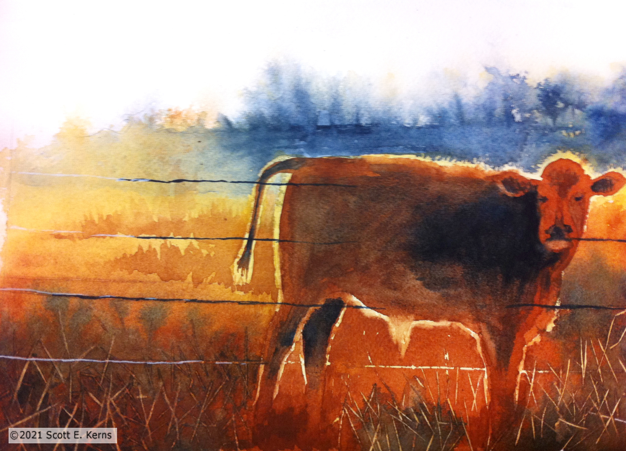 This watercolor painting features a cow in a pasture at sunset. In this piece I experiment with a style that favors loose brush strokes over detail. Tags watercolor painting cow cows sunset