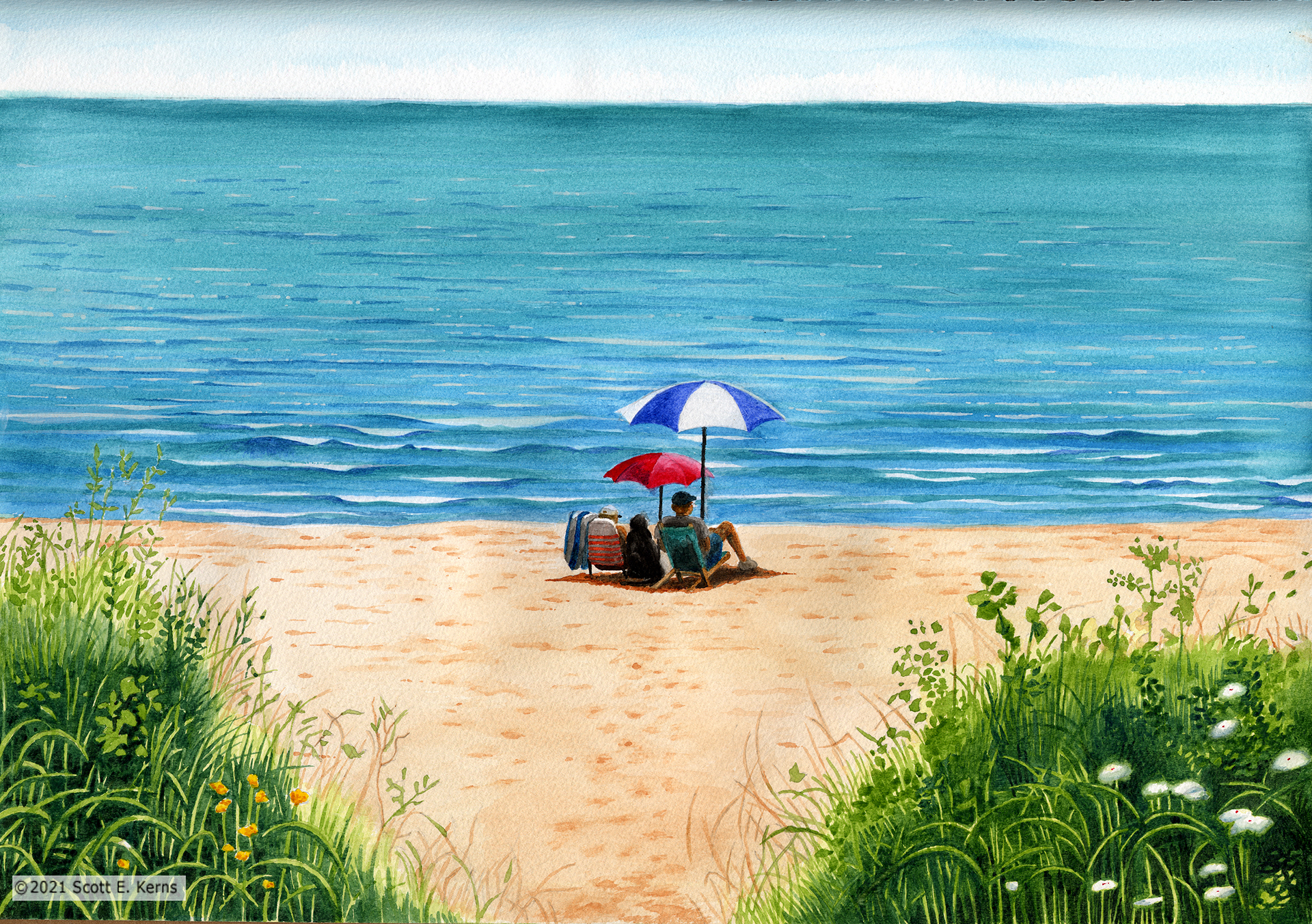 This painting references a family photograph taken at a sandy beach on the shores of Lake Erie in Ridgeway Ontario. Tags watercolor painting seascape landscape